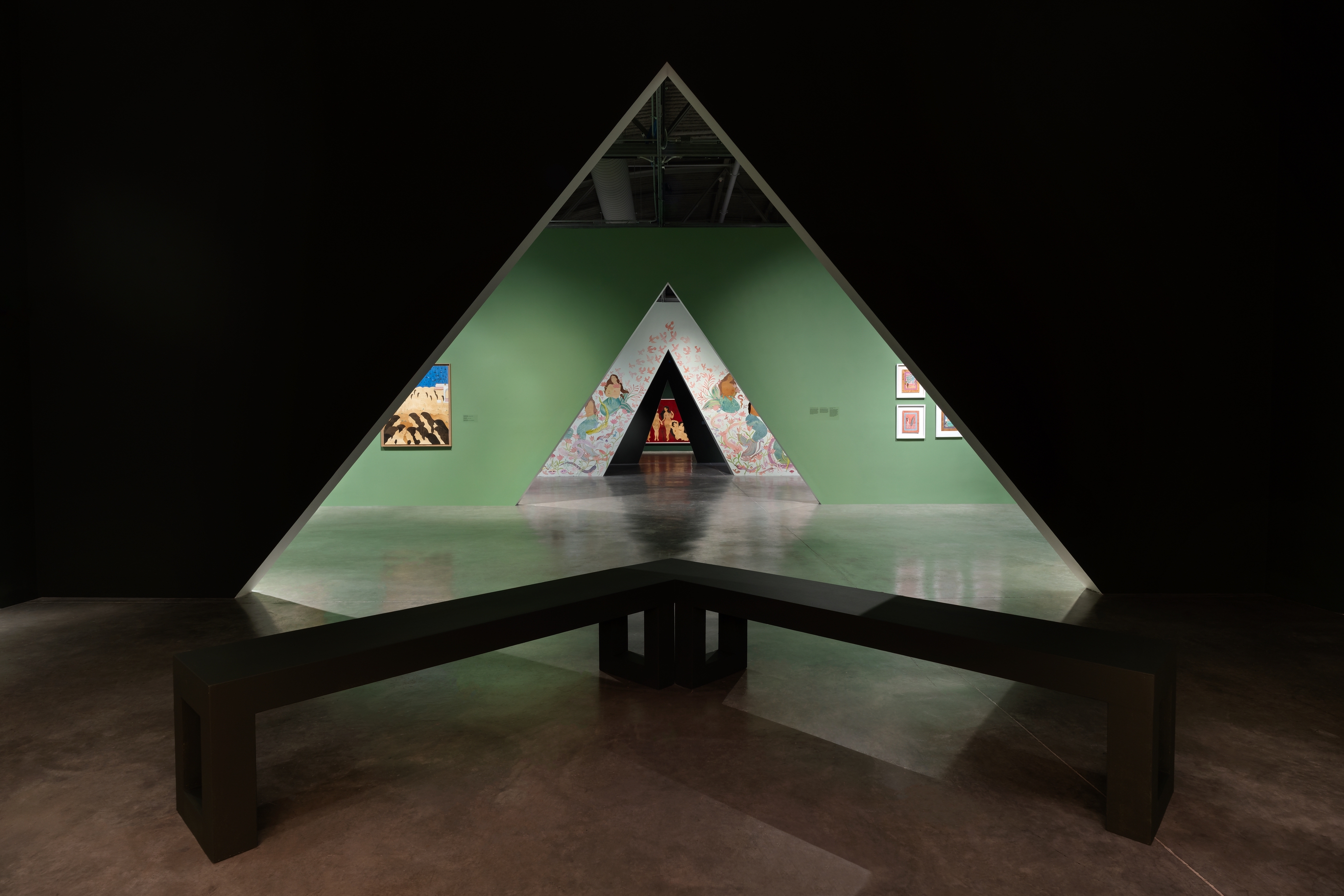 The curatorial layout draws inspiration from the Persian and Mughal char-bagh, a quadrilateral garden divided by water channels with a central fountain. These sixteenth- and seventeenth-century landscapes embodied harmony, spirituality, and transcendence. Within The Garden, this structure becomes a poetic framework, echoing Schahbaz’s language of multiplicity and transformation. It is important to note that the works were not created to fit this scheme; rather, the char-bagh is a curatorial concept that provides a lens for navigating the artist’s fluid and expansive practice.